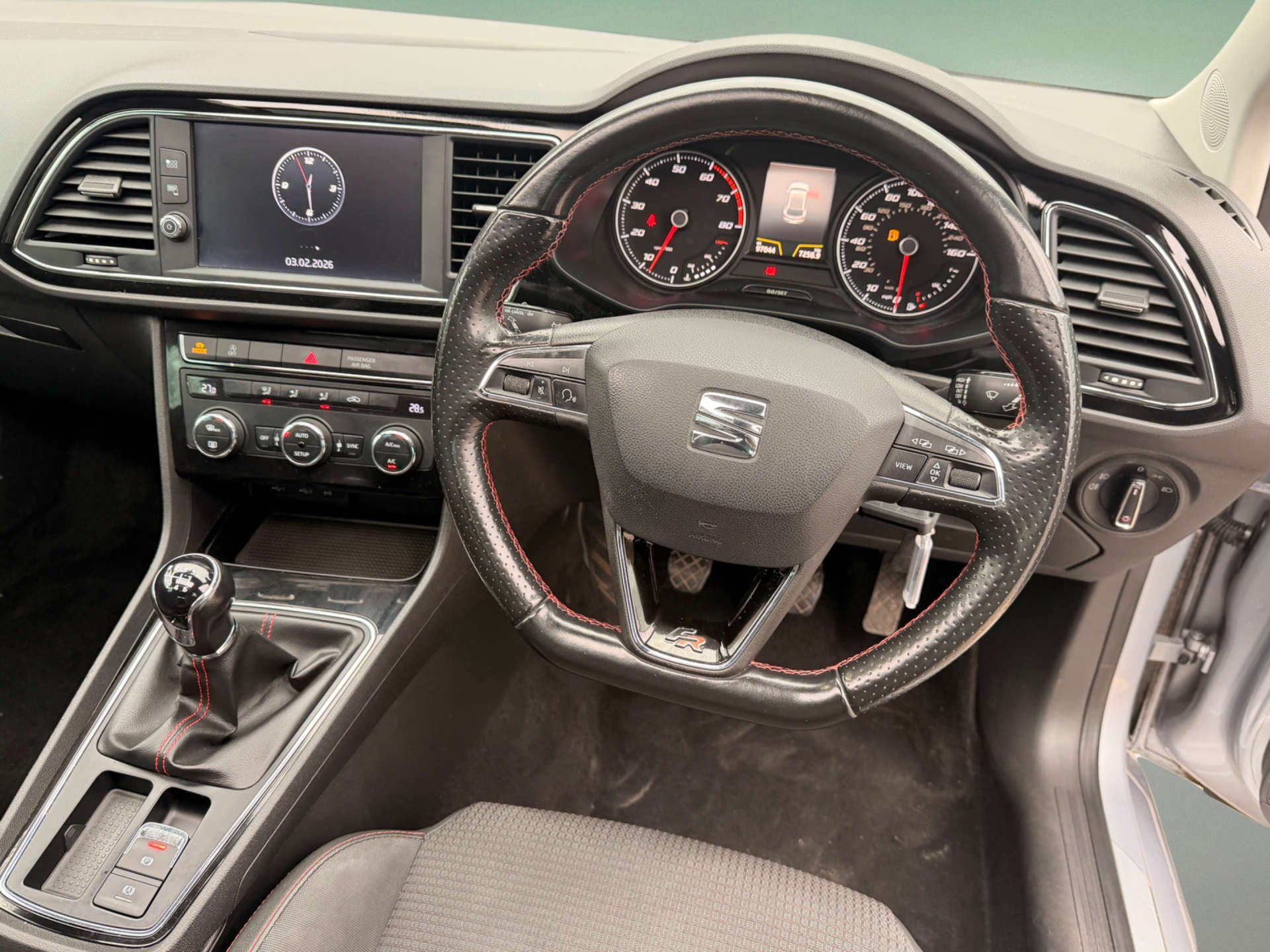 - Steering Wheel - Flat-Bottomed Perforated Leather with Red Stitching and FR Logo
